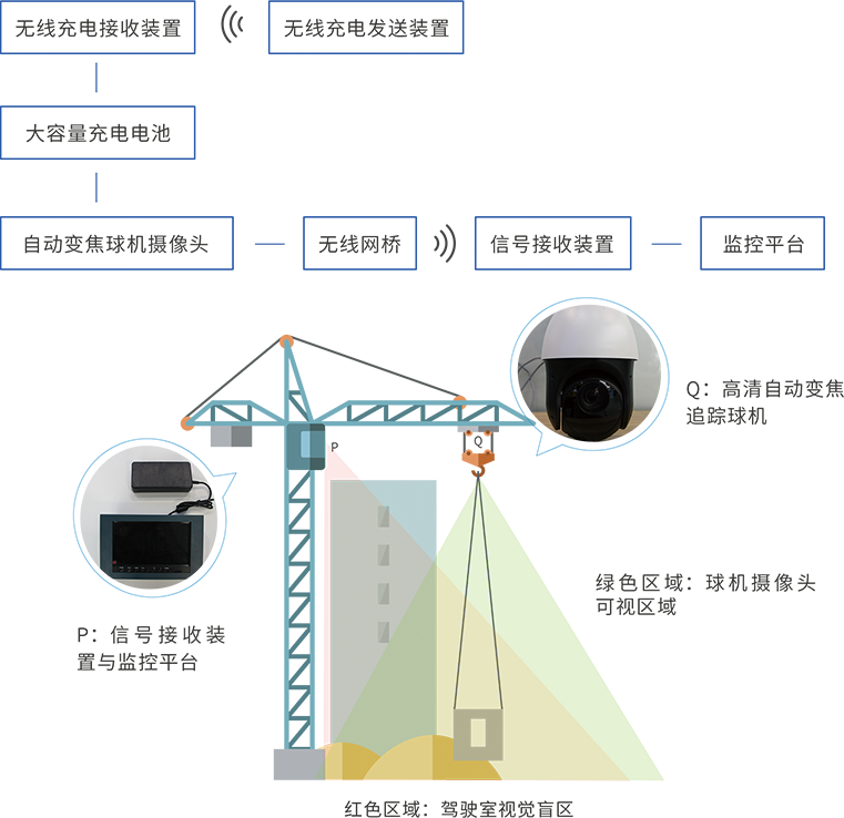 自动聚焦追踪吊钩动作画面,预防安全事故 采用无线充电技术,可以实现变幅小车电源自动充电 驾驶员从监控平台的显示屏上可以清晰看到吊钩实时动态画面 具有省时省力、受天气影响小、安全性高的优势